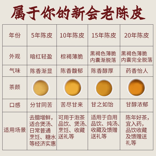 新会陈皮远近闻名,是得到大众认可的好陈皮。具有陈香四溢、顺养轻滋补的美誉。手工采摘制作,日常泡茶饮用,有助于身心健康。