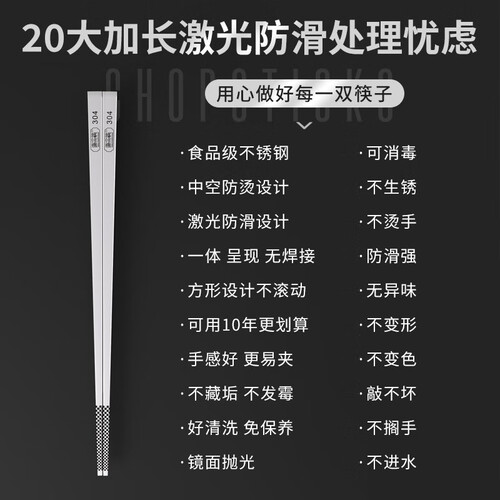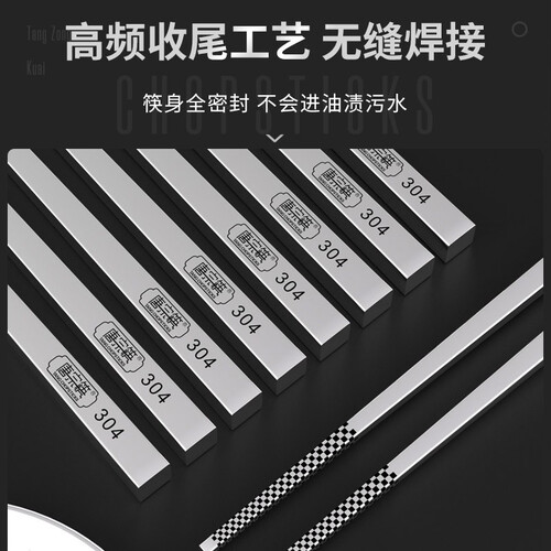选择304不锈钢生产,不生锈、不发霉、不变形,清洗更简单。严格生产,没有漆蜡,耐高温,可以健康使用的筷子。