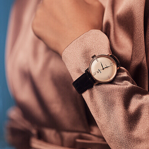 这款手表采用极简风格设计表盘,结合晶钻点缀,多角度绽放璀璨光芒。皮质表带纹理清晰,柔韧耐磨,尽显腕间复古格调。