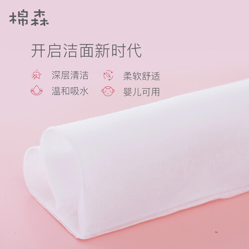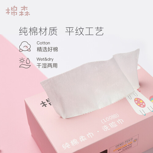 选取天然优质长绒棉制作,质地柔软细腻,采用无纺布工艺压织而成,亲肤柔韧不易扯破,干擦不掉絮,湿洗柔软服帖。