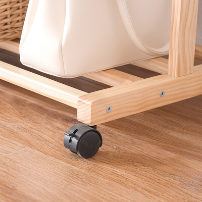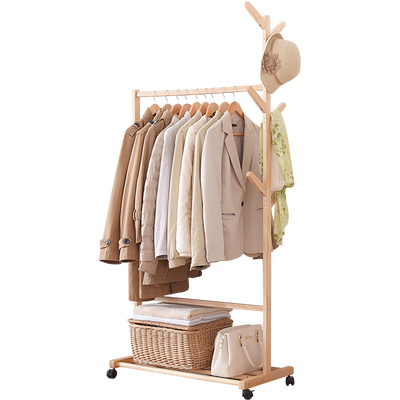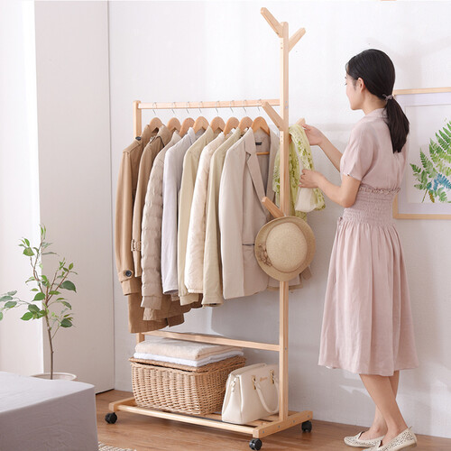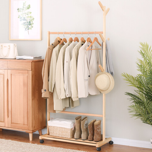 这款衣帽架的底部采用了滑轮设计,移动方便。右侧是树形支架,能收纳更多衣物。