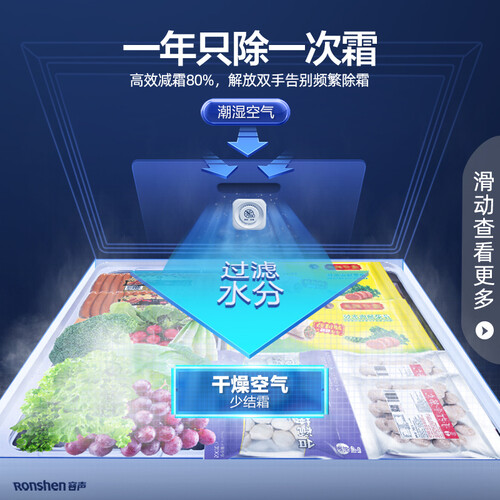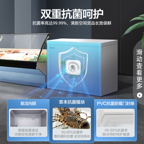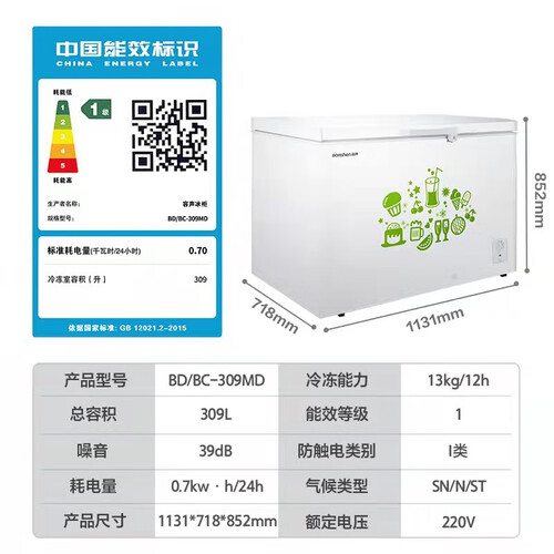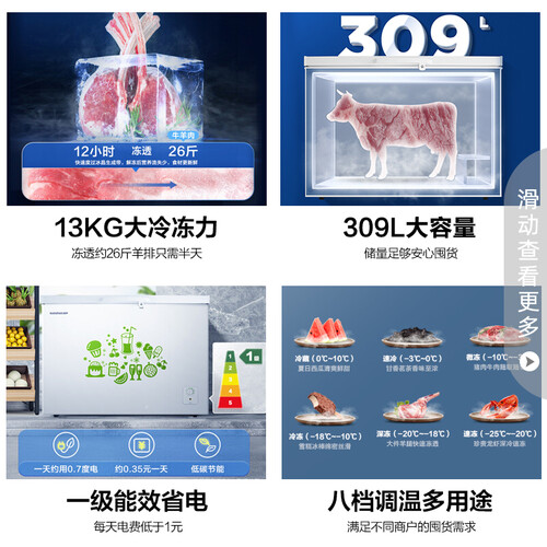 309L大容量设计,轻松容纳更多的食材,大件物品也可随意摆放。13kg冷冻力,迅速制冷无死角,达到深层锁鲜的效果。