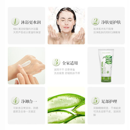 萃取芦荟提取物,泡沫绵密,洗后不会有紧绷感。同时具有舒缓肌肤的作用,令肌肤爽滑润泽,焕发光彩。