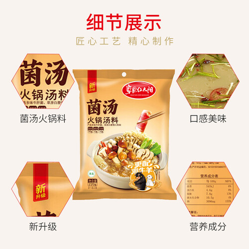 选用香菇、怀山药、枸杞等为原材料,品质有保证,让你吃的放心。采用合理配比,与多种菌类熬制而成,味道浓郁清香。