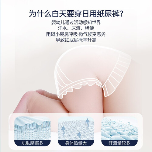 专利打造柔薄复合芯体,锁水能力强,不易断层起坨,宝贝活动更自在。人体工学U型剪裁方式,舒适贴合,自由舒展无负担。