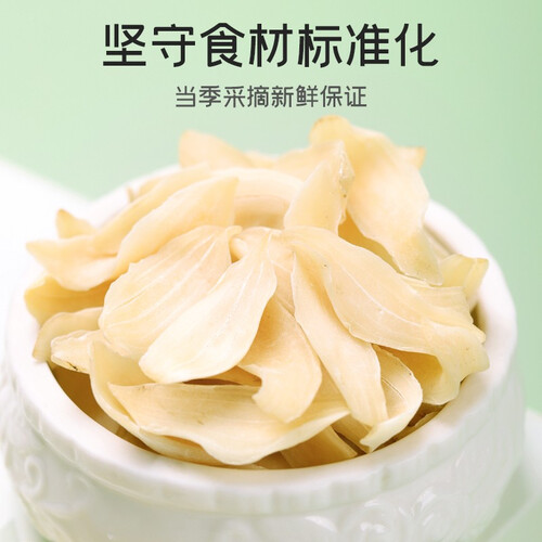 采摘新鲜百合自然晾晒,健康美味无负担,老人小孩都适合。拥有肥厚香甜肉质,色泽洁白如玉,为汤品增加上乘好料。