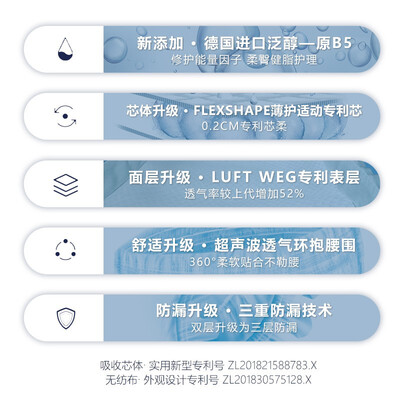 添加泛醇修护霜,有效滋养肌肤,避免屁屁发红发痒。0.2CM专利芯,瞬吸干爽,保持空气流通,屁屁舒适不潮湿。