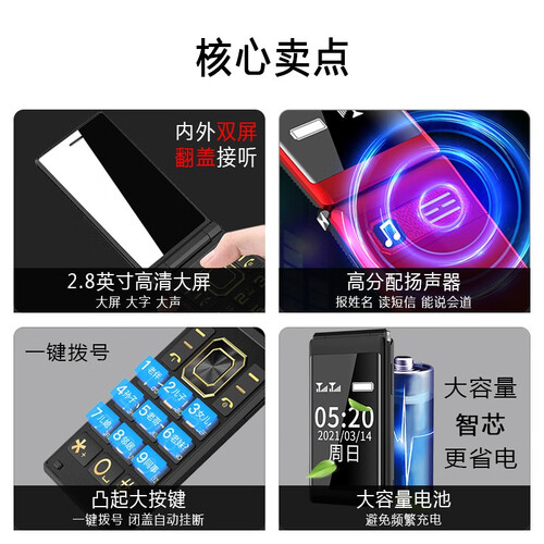 来电可以直接的翻盖接听,操作简单轻松,老人使用更加轻松方便。支持9个亲情拨号,老人给家人打电话更加便捷。