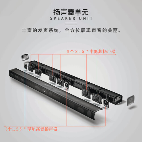 拥有电影音乐等五种声音模式,可根据观看内容切换相应模式,为您带来更真切的聆听。可轻松连接4K设备,为您带来身临其境之感。