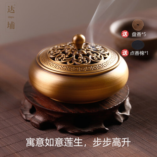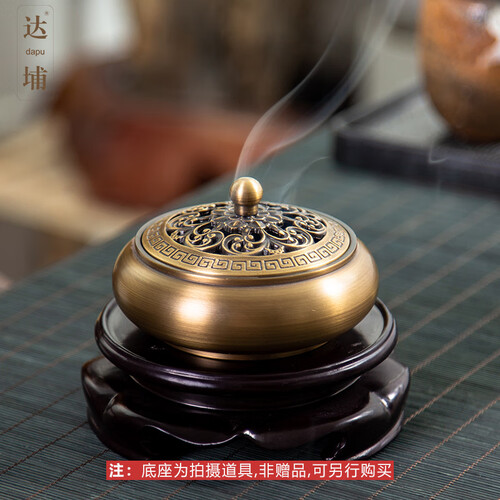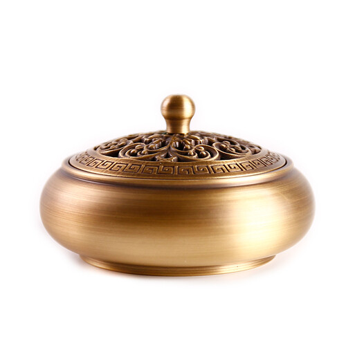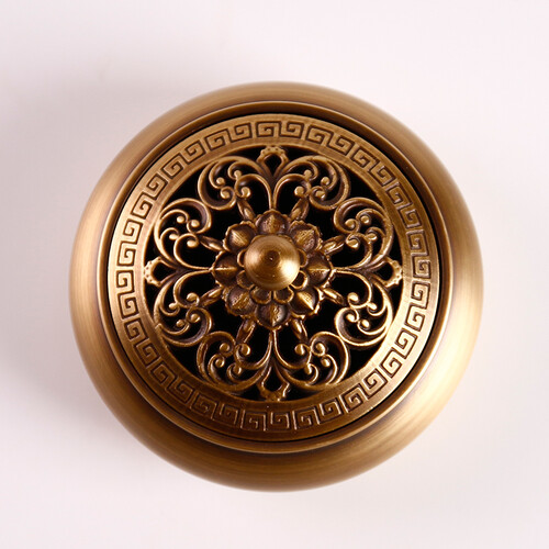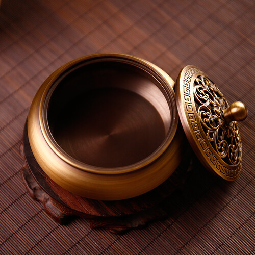 以铜为原料,经精心打磨制作,炉身光泽感强且表面平整光滑富有质感,小巧不失别致。花纹雕刻工艺精湛,不仅美观而已寓意美好。