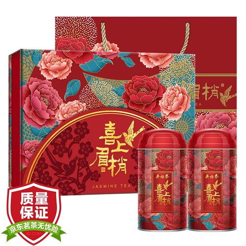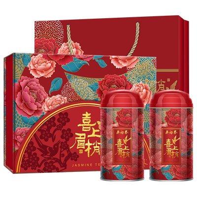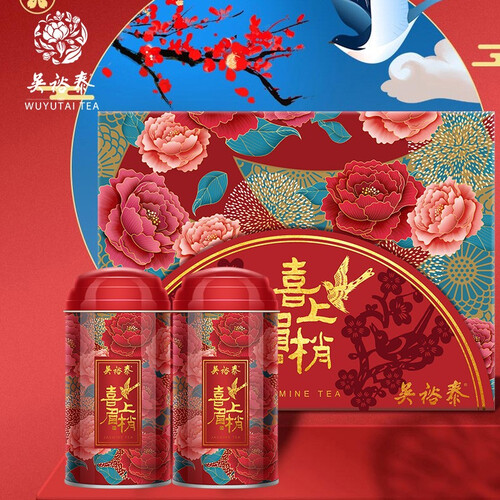 采用传统红红火火的喜庆包装,有着花开富贵、喜上眉梢的寓意。选用非遗窨制技艺制作花茶,香浓爽口,入口回甘迅速。