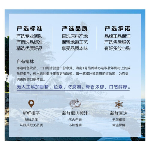 源自椰子之乡海南文昌,椰子汁水丰富,椰香浓郁。新鲜椰子汁浓缩,不含防腐剂、胆固醇,享受自然美味。