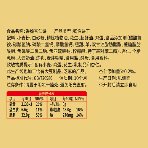 精选小麦粉、杏仁和鸡蛋等食材为原料,精心烘焙出来的饼干色泽金黄,表面大块的杏仁清晰可见,吃到嘴里酥脆有嚼劲,口口足料。