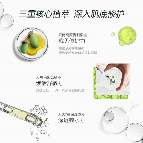 加入云南高原青刺果油,搭配甘油、透明质酸钠等成分,为肌肤打造水屏障,助力补水锁水。并且容易吸收,减轻肌肤负担。