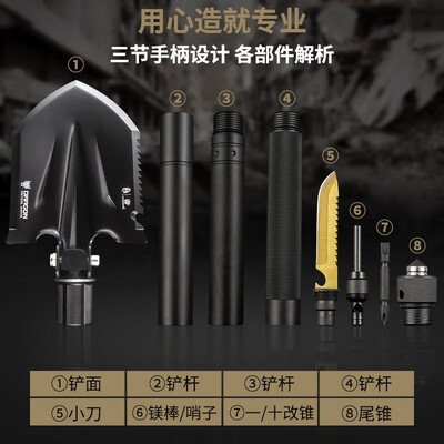 具有三节的手柄设计,可以随意调节铲子的长度,旋转安装也很方便。铲面具有锯齿设计,户外锯木头锋利又快速。
