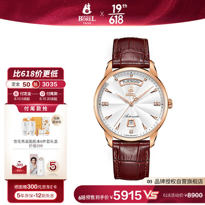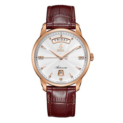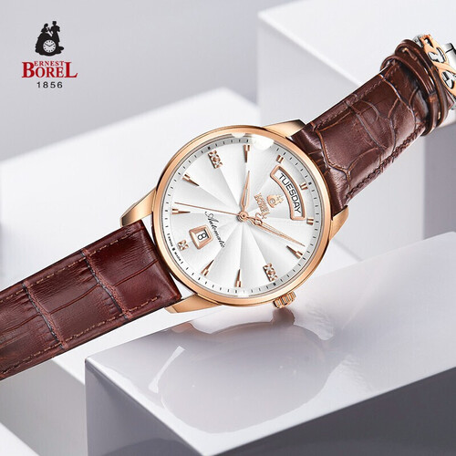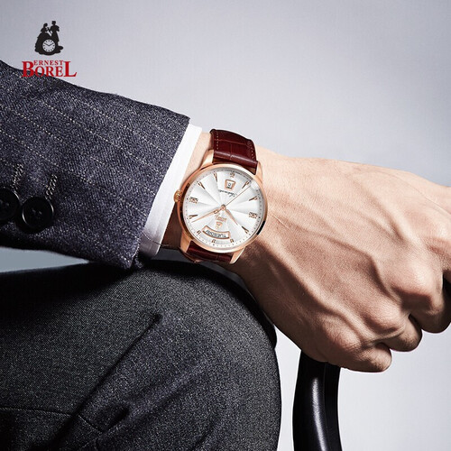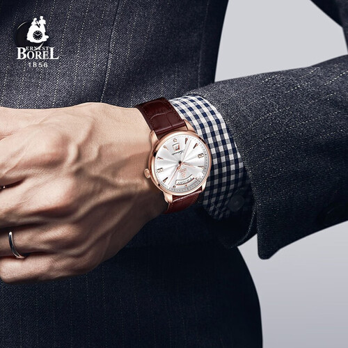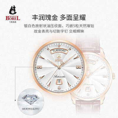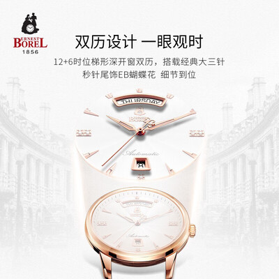 手表在三点,六点和九点3个方向总共镶嵌有五颗天然钻石,浪漫时尚。双日历显示,为日常日程安排提供更多方便。
