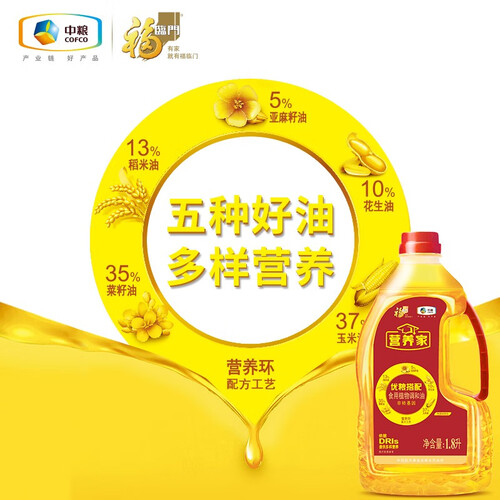 油品包含了稻米油的纯、菜籽油的香、玉米油的甘、花生油的润和亚麻籽油的醇,五种优质油品按照科学配比调制,气息香浓无比。