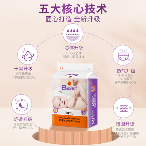 婴儿零触感丝柔纸尿裤,采用复合3D压花丝柔面层,瞬吸锁水不反渗,吸水后不易膨胀,透气性始终如一。