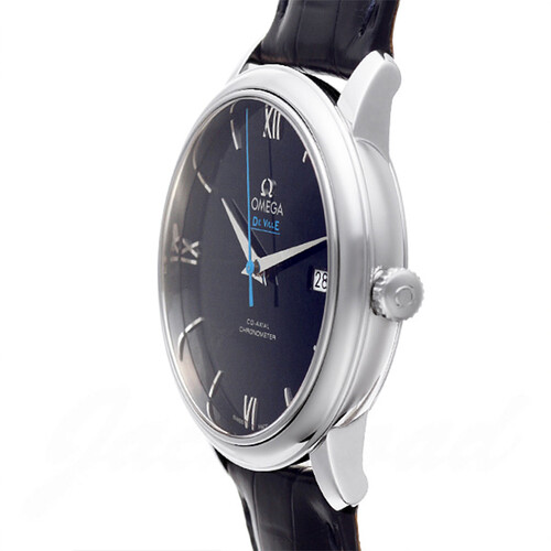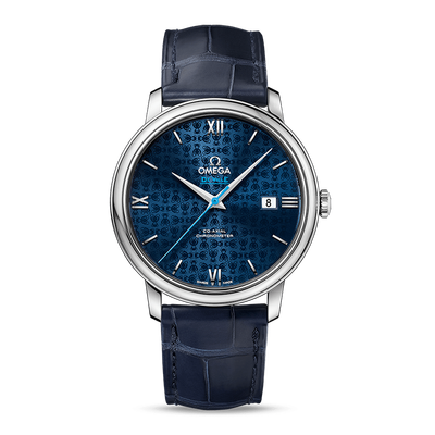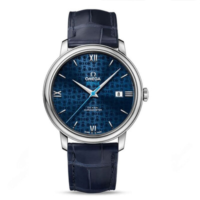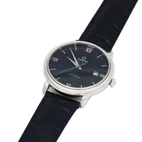 此款手表为欧米茄碟飞系列,蓝盘皮带雅致华美。机芯为自动上链计时机芯,表盘配备抛光弧拱形罗马数字与蓝色中央秒针,庄重精致。