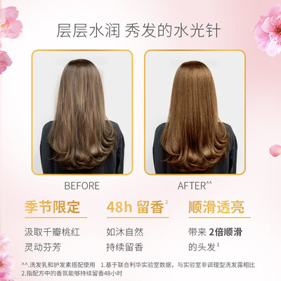 添加补水因子赖氨酸,补充头发水分,缓解发丝的干燥问题。汲取灵动芳香,浪漫的桃花香味缓缓绽放,增添一丝优雅的味道。