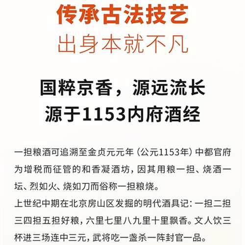 酿酒师历经4年倾心打造出经典的二锅头美酒,呈现出独特的色香味口感,品尝时间佳酿。酒体透明挂杯,清香扑鼻,入口醇厚爽净。