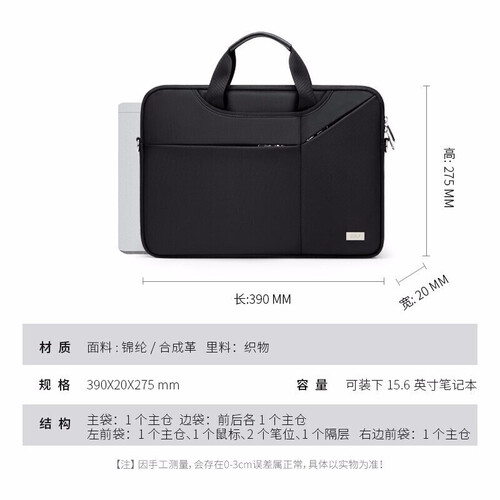 大容量设计,可收纳15.6英寸笔记本电脑。采用尼龙布料,防水耐蹭。