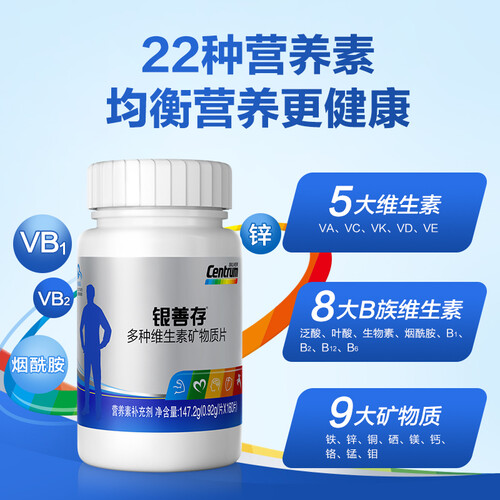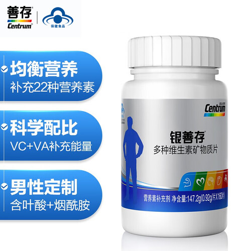 蓝帽子认证,科学配比,营养价值高。每片含5大维生素、8大B族维生素和9大矿物质,满足中老年男士所需营养。