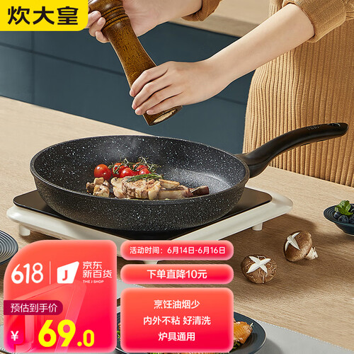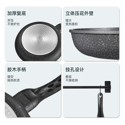 锅身外表压制精美花纹,简约时尚,尽显艺术之美。优选进口健康涂层,强力不粘,附着力强,耐磨耐用。无铆钉设计,内外易清洁。