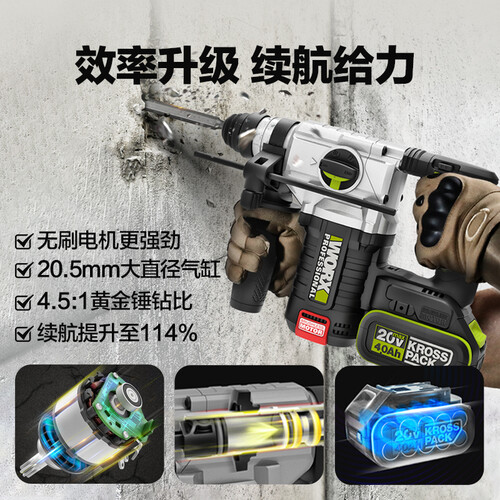 拥有20.5mm大直径气缸设计,通过气缸式锤击,令破拆更轻松。结合4.0AH单包续航锂电池,持续供电,续航力大大提高。