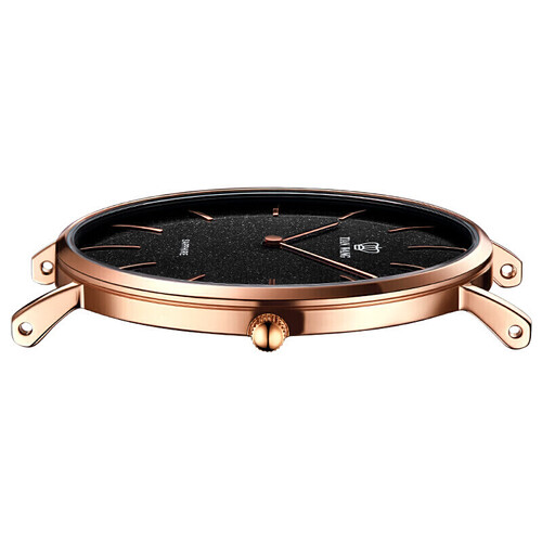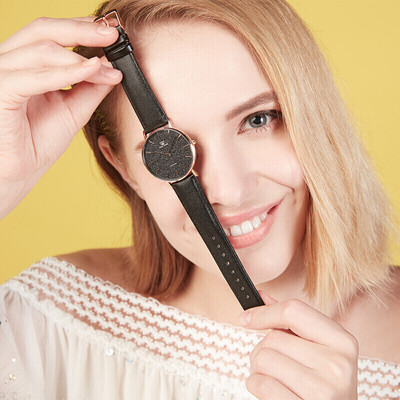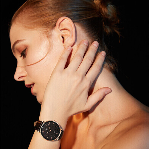 手表采用了皮质的表带,有很好的柔韧性和透气性。玫瑰金的表壳加上星空磨砂黑,给我们带来别致的视觉体验。