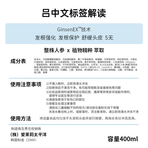 蕴含艾草和牡丹皮成分,有效控制油脂分泌过多的情况,保持秀发干净清爽。还有绿茶和生姜提取物,舒缓头皮,让头发舒适无负担。