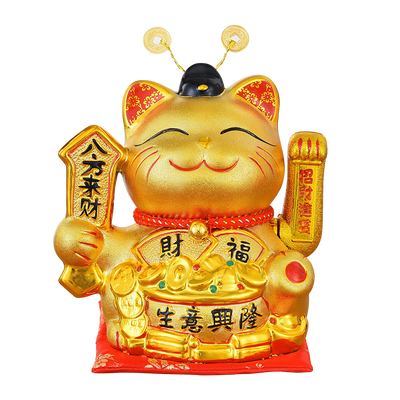 本款神采奕奕的金猫,代表着财源滚滚来,一手八方来财,一手招财进宝,寓意吉祥;胸前一个聚宝盆,立体元宝设计,祝生意兴隆。