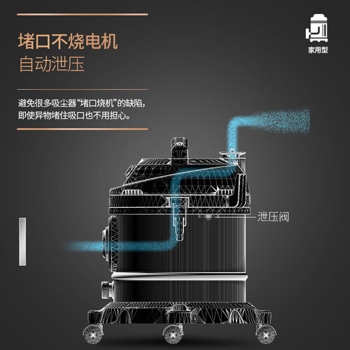 吸尘器配备大功率电机,动能强劲吸力十足,一推即清方便省力。堵口不烧电机,自动泄压,即使异物堵住吸口也不用担心。