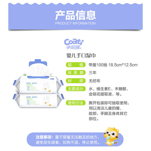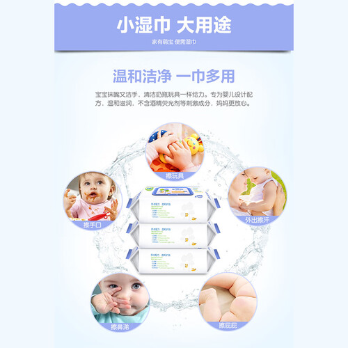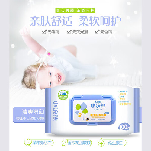 添加维生素E、金银花提取液和木糖醇,不含酒精,呵护宝宝娇嫩肌肤。无纺布材质,柔软舒适,温和湿润,婴儿适用。