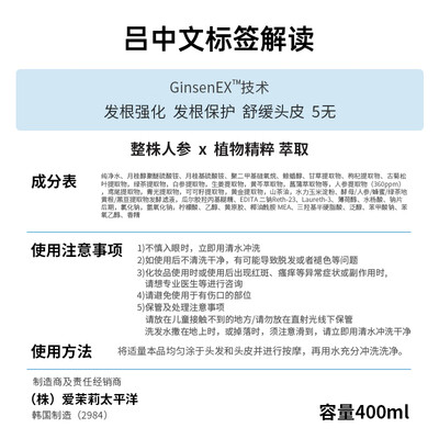 人参精华,令发丝强韧丰盈。药艾牡丹皮成分,调节油脂分泌。生姜绿茶成分,缓解外界环境对头皮的伤害。