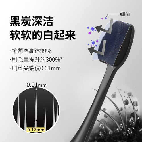 刷毛仅为0.12mm,采用超密一体式植毛工艺,足以呵护牙龈和牙釉质。蕴含备长炭微粒,能够吸附口腔异味,时刻保持口气清新。