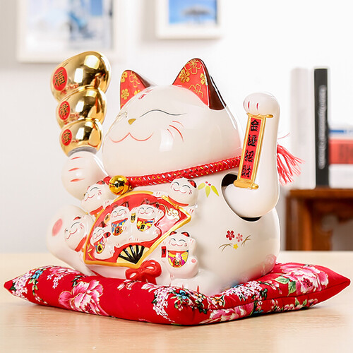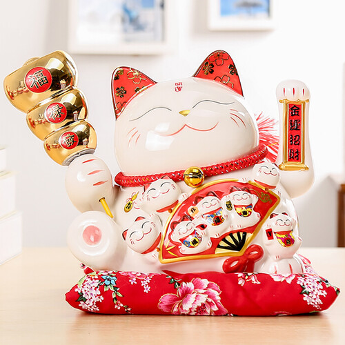 10英寸招财猫,手中拿着福禄寿三个元宝,蕴含着开运招财的美好寓意。通电后手可自由摆动,形象生动更显有趣,令人心情愉悦。