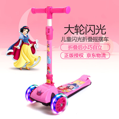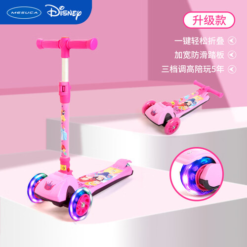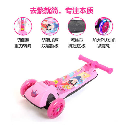 迪士尼儿童滑板车,双层加厚踏板,一秒折叠,四轮全闪,防滑手柄,可调节开关,铝合金车身,重力转向系统,滑行更稳定。