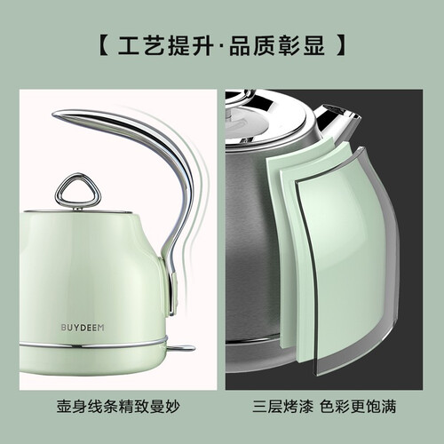 这款电热水壶采用弧度美学调试,打造美观的外观,壶身采用不锈钢设计,符合食品级的标准,高温油漆,锁色耐磨。
