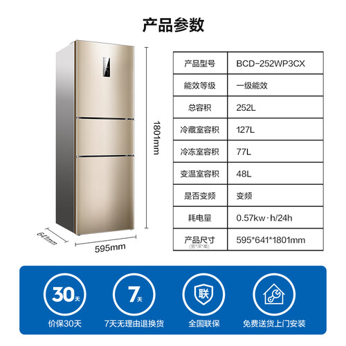 优质的变频压缩机,低至37分贝的运行声音,使用更放心更省心。新升级的风冷技术,极好的保湿保鲜性能,无需手动除霜。