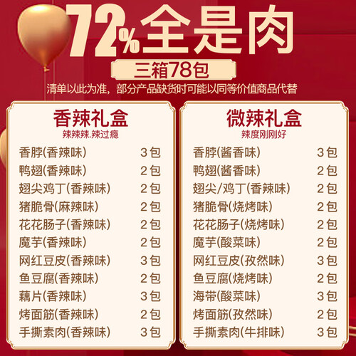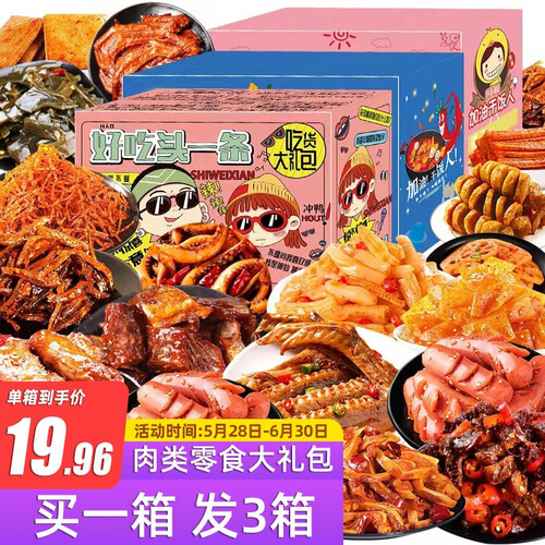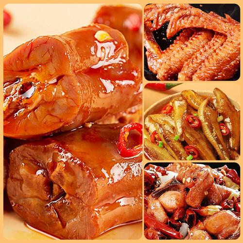 零食大礼包里含有炸酱鸭翅、口水酱排、炸酱鸡爪等美食,香辣入味、色泽金黄,咬一口美味绽放,满足味蕾所需。
