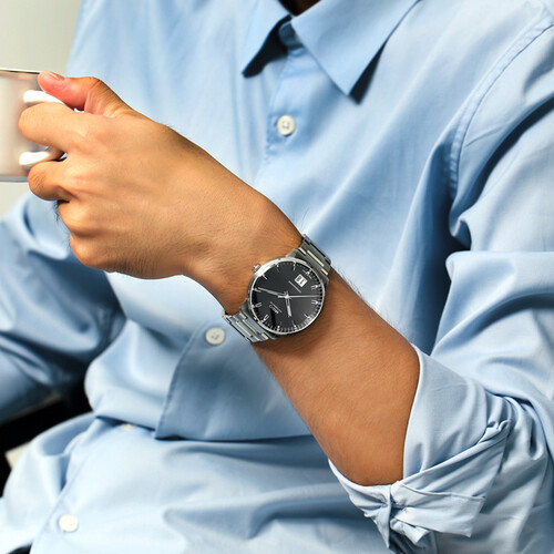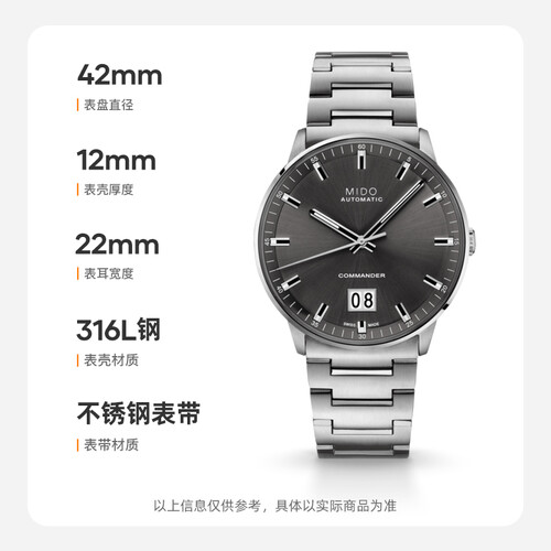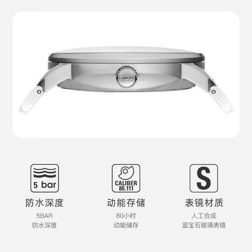 50米防水深度,提升安全系数,日常洗手无需摘下。不锈钢材质的表带,坚硬牢固,耐磨耐用。具备80小时动能存储,使用安心。