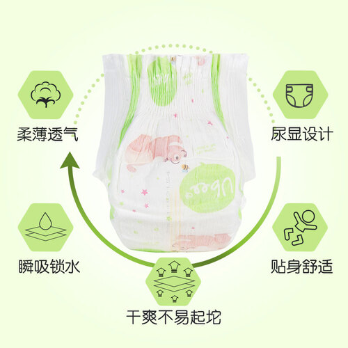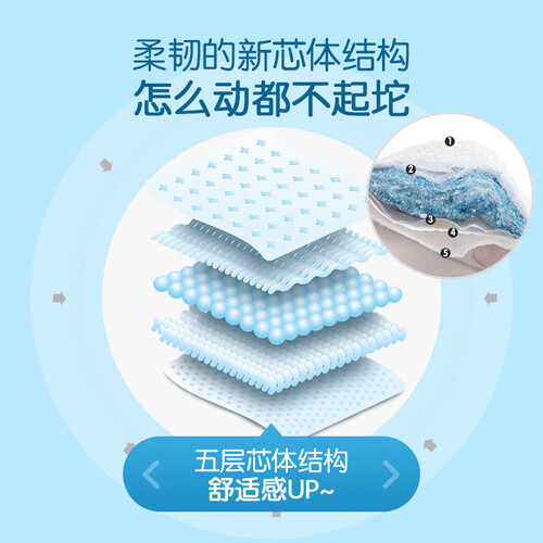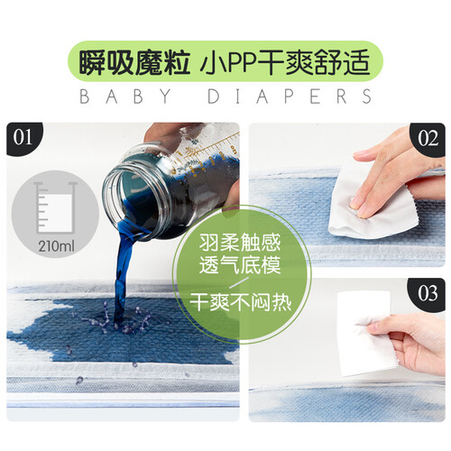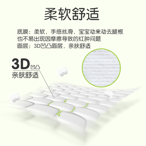 幼蓓纸尿裤,3D凹凸表面,交叉芯体结构设计,瞬吸导流加倍锁水,同时增加空气流通不闷热,减少宝宝红PP的概率,整夜舒爽。