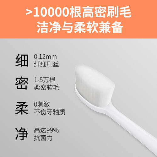 一万根纤细柔丝刷毛,增大接触面积、提升清洁效率,柔软温和零刺激,很适合牙齿易敏感人群,添加银离子避免生菌、呵护口腔健康。