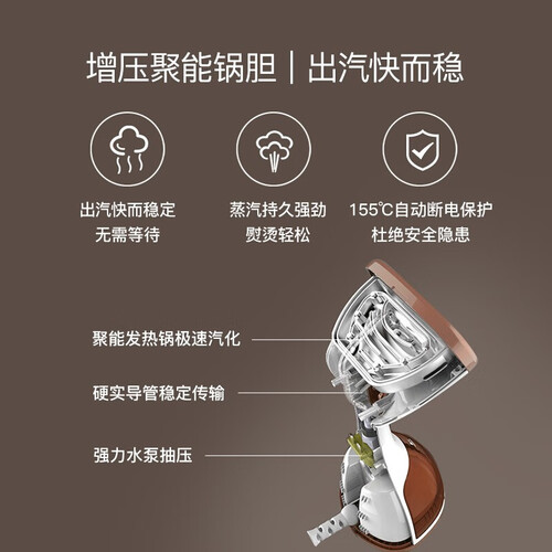 这款挂烫机采用增压聚能发热锅胆设计,能够快速释放蒸汽,无需久等。无螺钉的304级不锈钢面板,熨烫更顺滑。