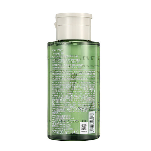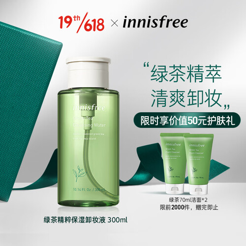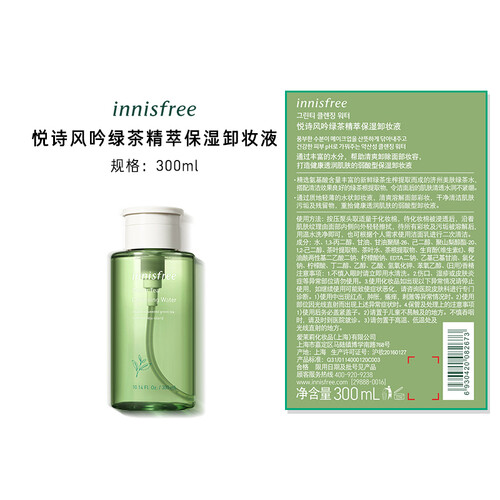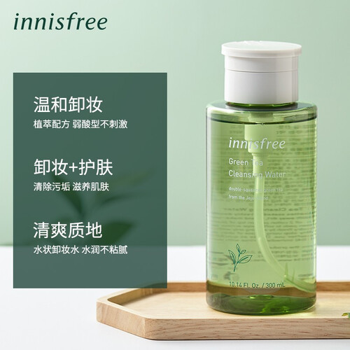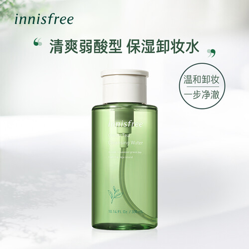蕴含丰富的济州美肤绿茶水,可使肌肤清透水润不紧绷;属于弱酸型水状卸妆水,可溶解面部彩妆,干净清洁肌肤。
