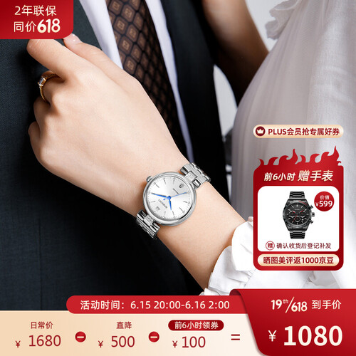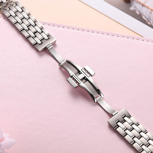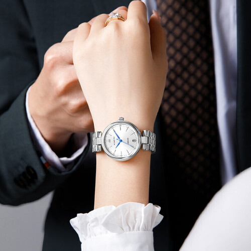 在白盘钢带的基础上,采用了蓝色的指针,非常亮眼,具有优雅时尚气息,同时整体线条流畅饱满,衬托手腕的柔美。