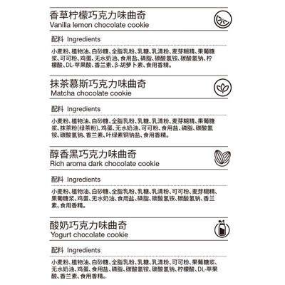 含有四种口味的曲奇饼干,饼干酥脆,夹心香甜,满足全家人的口味需求。配合甄选的优质原料,品质上乘,食用健康。