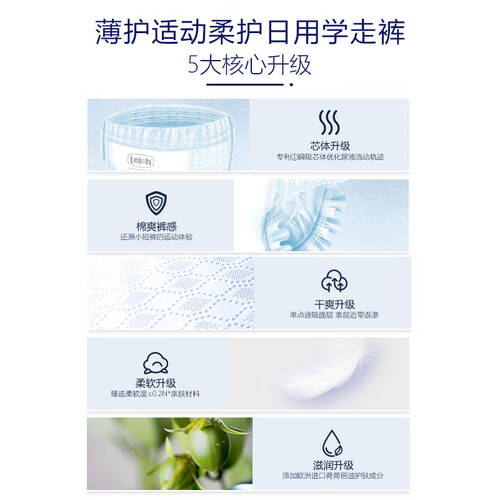 轻薄的芯体,拥有不断层和瞬吸效果,让宝宝更加清爽舒适。科学剪裁的裤型,富有弹性,贴合宝宝肌肤,方便穿脱无束缚。