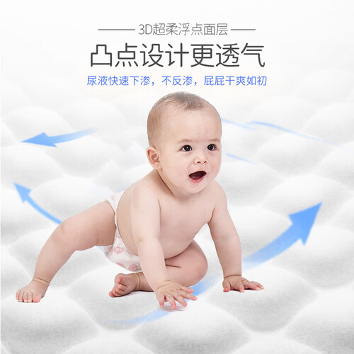 双重柔面,舒适手感,温柔呵护小屁屁。浮点设计,吸收更加饱满,干爽自在,透气不捂屁屁,告别粘腻感。